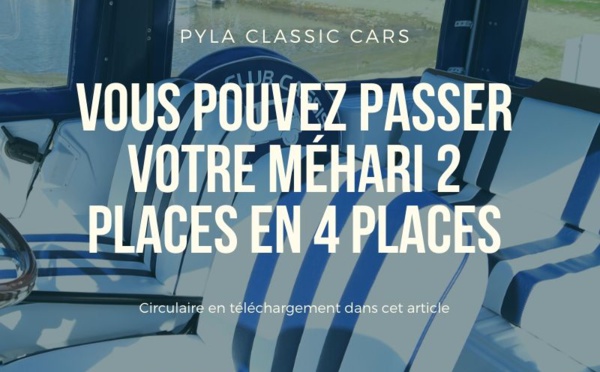 Une circulaire ministériel (en lecture sur cette page) vous permet de passer votre Méhari 2 places en 4 places sans modification de carte grise. La Dreal affirme que cette circulaire est toujours en vigueur.